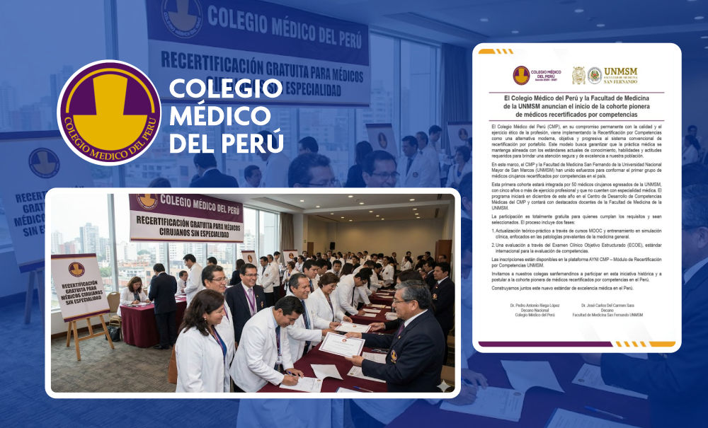 El Colegio Médico del Perú -CMP, anunció el inicio de un programa pionero de Recertificación por Competencias para médicos generale, que busca garantizar que la práctica médica se realice con los estándares actuales de conocimientos, habilidades y actitudes requeridas para brindar una atención segura. A través de un comunicado, el CMP informó que este programa estará a cargo del Centro para el Desarrollo de Competencias Médicas, contará con docentes de la facultad de medicina de la Universidad Nacional Mayor de San Marcos y es totalmente gratuito. Las inscripciones están disponibles en la plataforma AYNI del CMP-Módulo de Recertificación por Competencia UNMSM. |