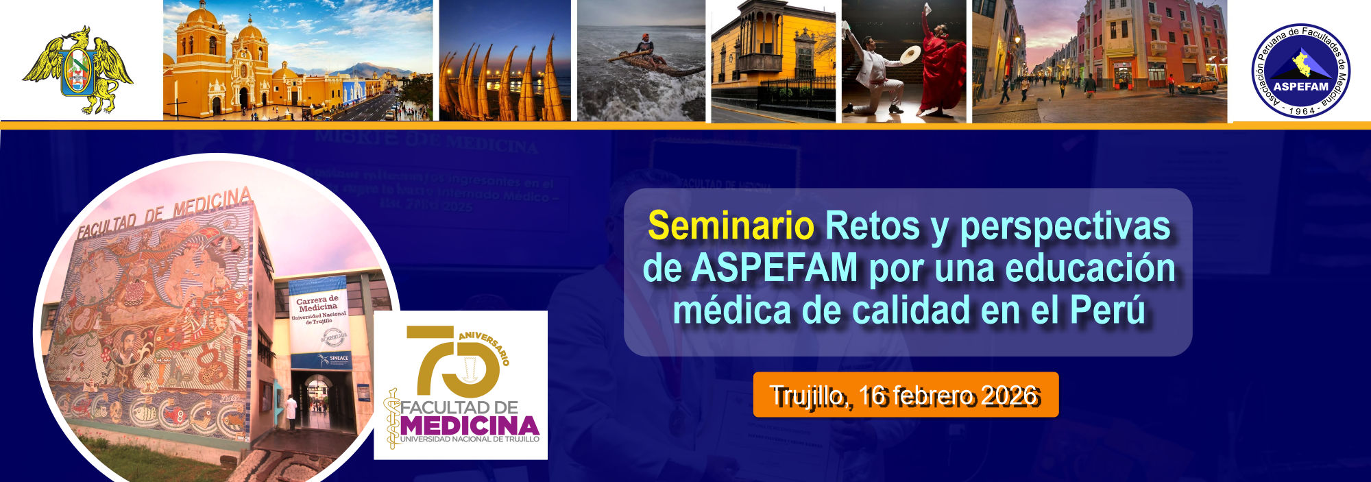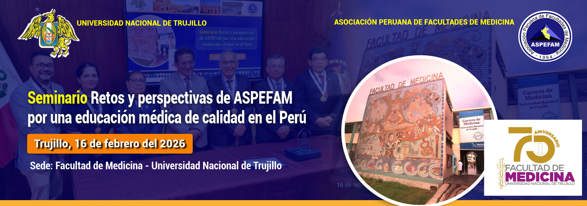ASPEFAM y la Facultad de Medicina de la Universidad Nacional de Trujillo, han organizado el Seminario “Retos y perspectivas de ASPEFAM, por una educación médica de calidad en el Perú”, espacio académico orientado a la reflexión y el intercambio de propuestas para fortalecer los estándares de formación médica a nivel nacional.
