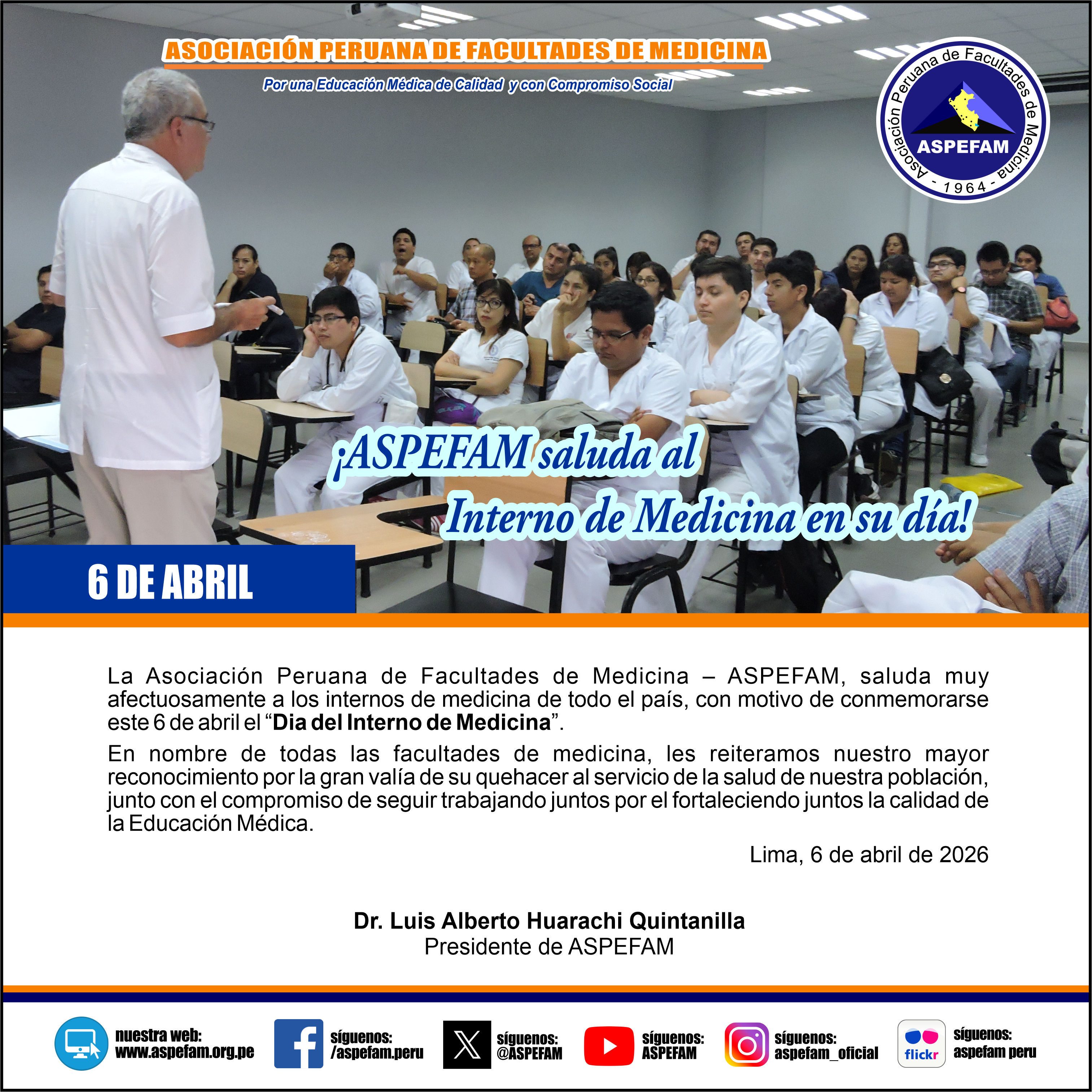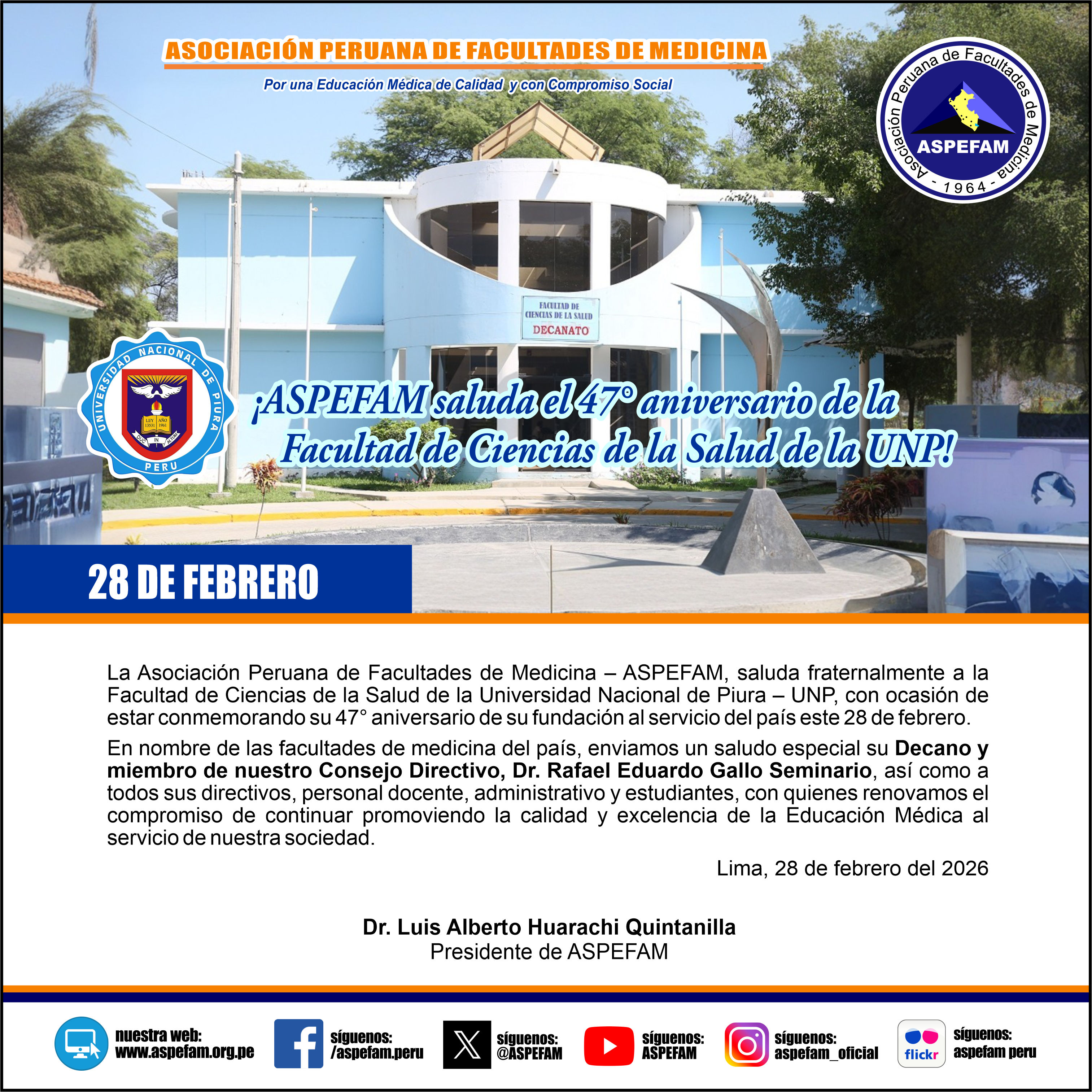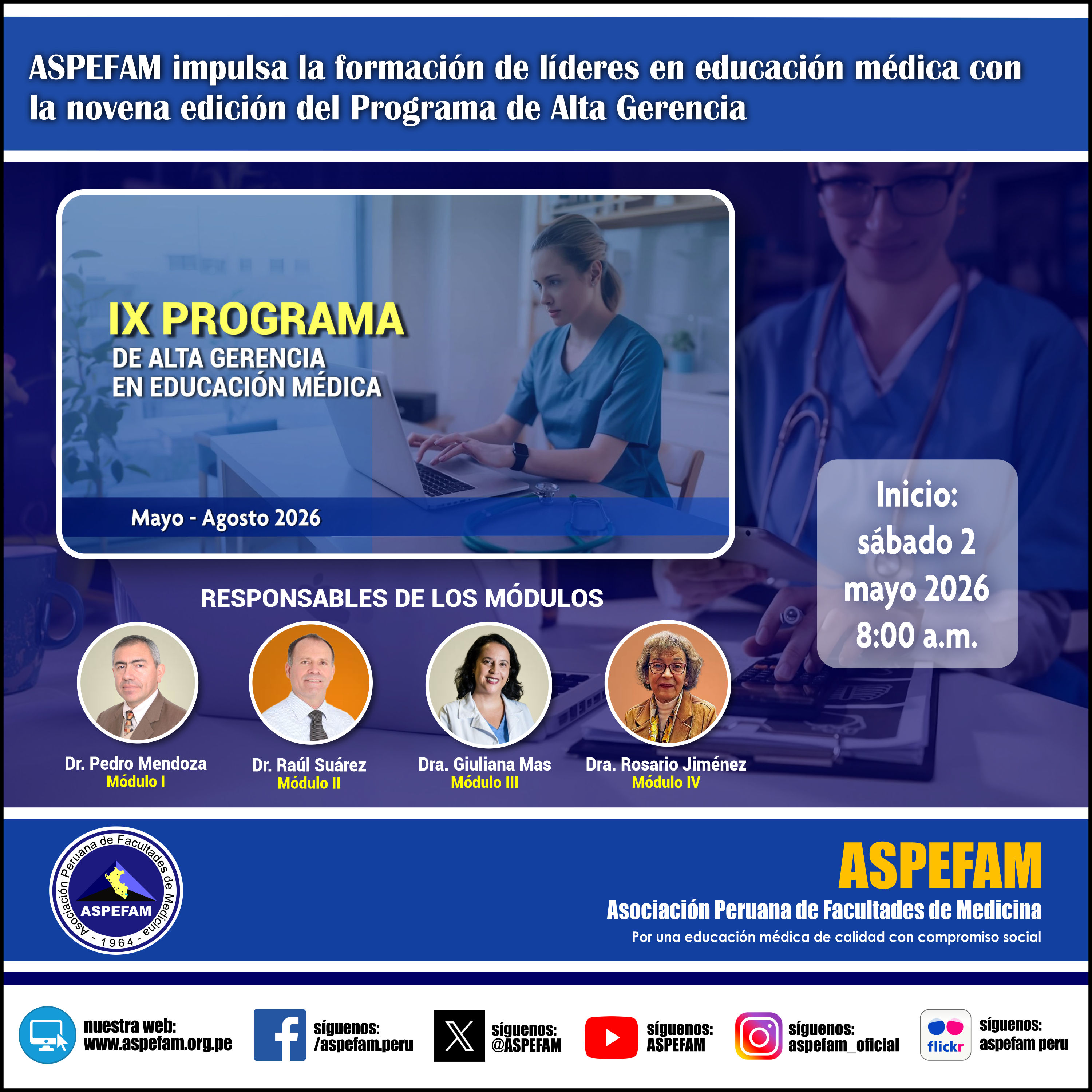 Resumen: El VIII Programa de Alta Gerencia en Educación Médica (PAGEM 2025), organizado por la Asociación Peruana de Facultades de Medicina (ASPEFAM), ha permitido fortalecer de manera estratégica las capacidades de gestión académica, administrativa y gerencial de los decanos, directivos en funciones y docentes llamados a asumir cargos directivos en las facultades de medicina del país, en un contexto marcado por crecientes exigencias de calidad, acreditación y sostenibilidad institucional...